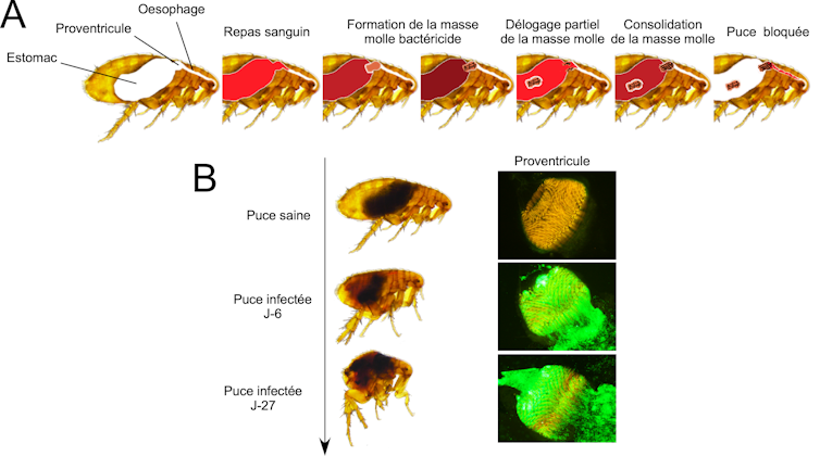 L’infection fait suite à un repas de sang sur un mammifère contaminé. Le sang contenant les bactéries traverse l’œsophage et le proventricule – une valve s’ouvrant périodiquement pour laisser passer le sang et empêcher sa régurgitation au point de succion – avant d’être déversé dans l’estomac pour y être digéré. Le bacille s’installe alors dans le tube digestif de l’insecte. Ce qui au bout de quelque temps (a minima 5 jours plus tard) a pour effet d’empêcher l’insecte de se nourrir, en constituant un bouchon bactérien très solide dans le proventricule.
